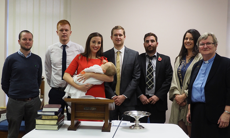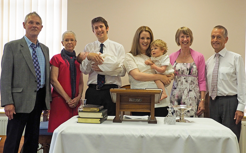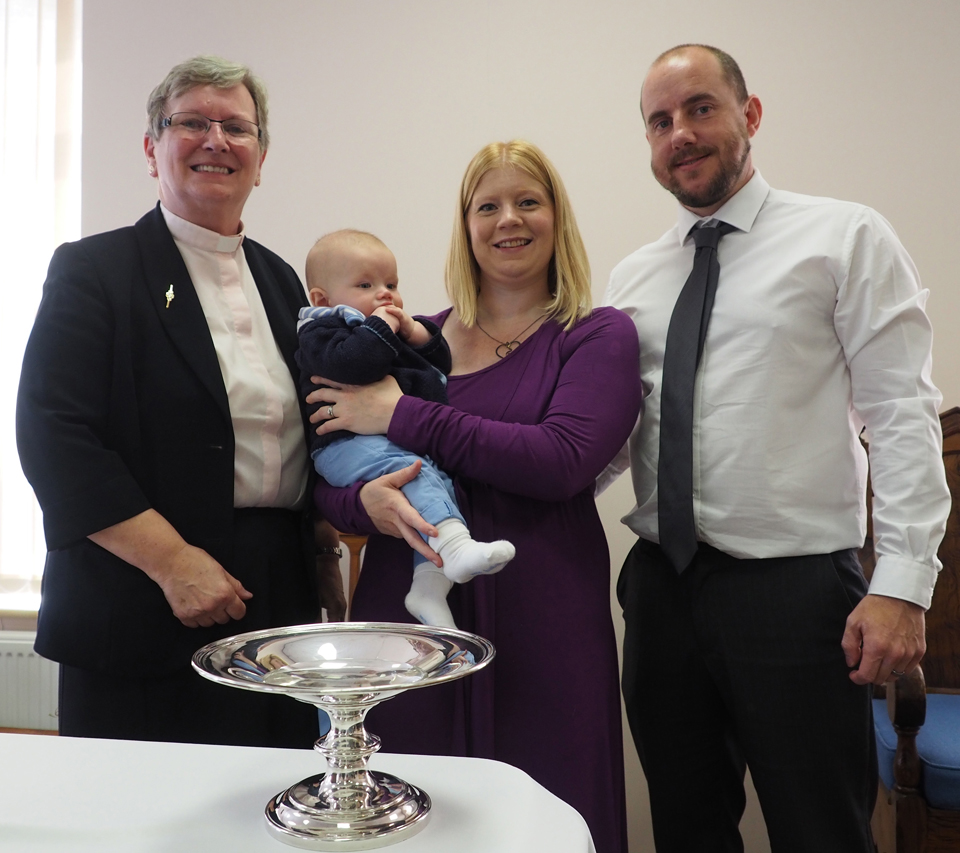 Cyflwynwyd y Dystysgrif Fedydd i'r rhieni gan Delyth Elias, ysgrifennydd yr eglwys a'r cyfeilydd oedd Karen Owen. Yn y llun gwelir y teulu yng nghwmni'r gweinidog.