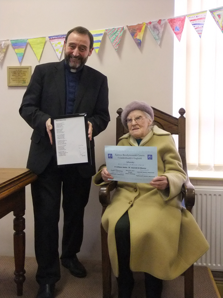 Yn ystod Cyfarfod Gwanwyn Cymdeithasfa’r Gogledd ym Mlaenau Ffestiniog yn ddiweddar cawsai cyfraniad Miss O’Brien Owen ei nodi, a chyflwynwyd tystysgrif ynghyd a llythyr gan y Llywydd iddi gan y Gweinidog yn ystod yr oedfa hon.